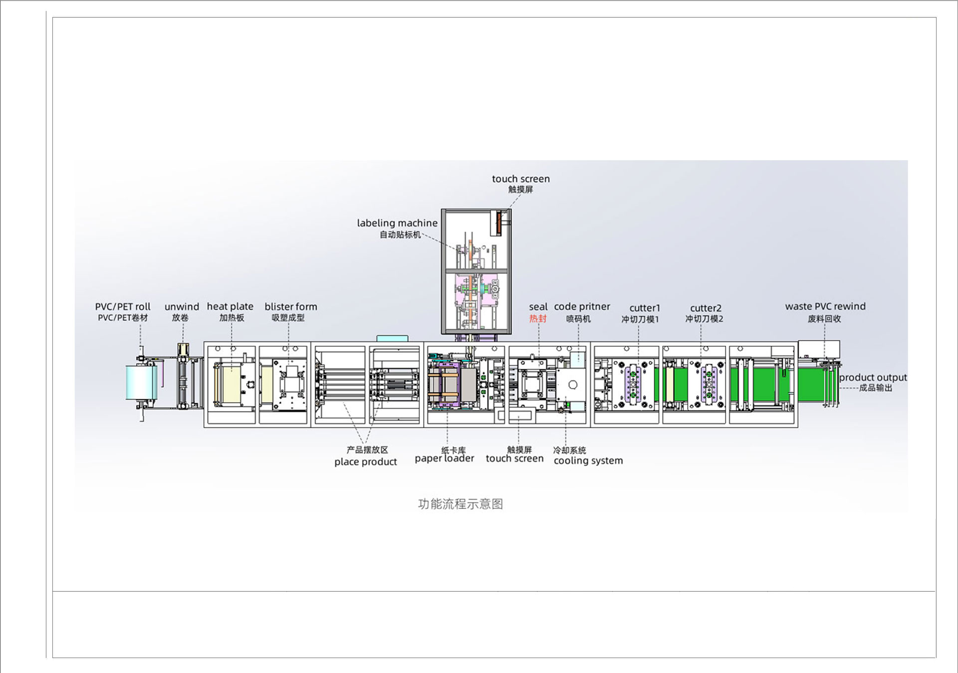 Machine automatic forming blister, dropping paper card, heat sealing, cutting, automatic product output and residual material recovery.